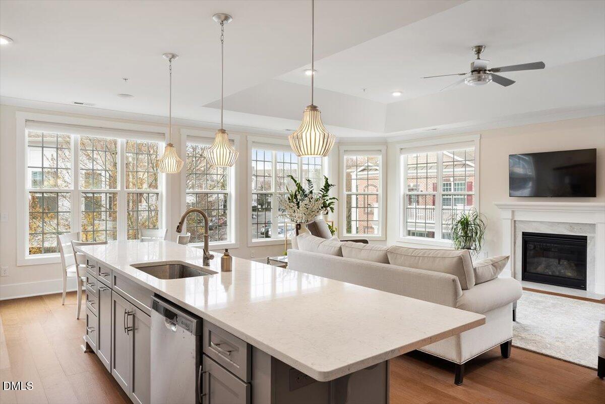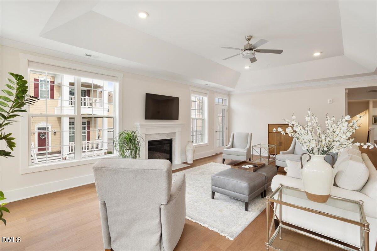 A spacious garage and effortless elevator access set the tone for a lifestyle defined by comfort and sophistication. Inside, abundant natural light pours through oversized windows, highlighting new hardwood floors that flow throughout the main living areas and elevate the home's modern appeal. The elegant family room, anchored by a marble-encased fireplace, creates a warm yet grand focal point, while custom electronic/automated blinds provide both convenience and ambiance at the touch of a button.