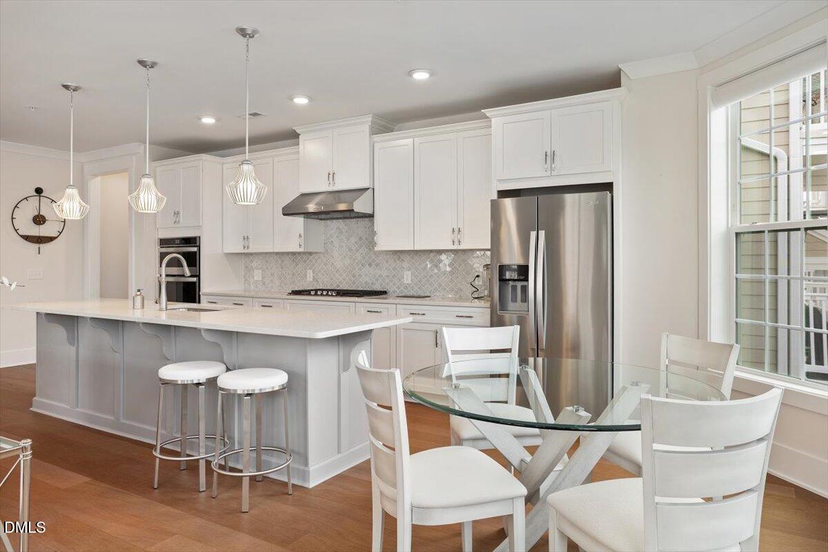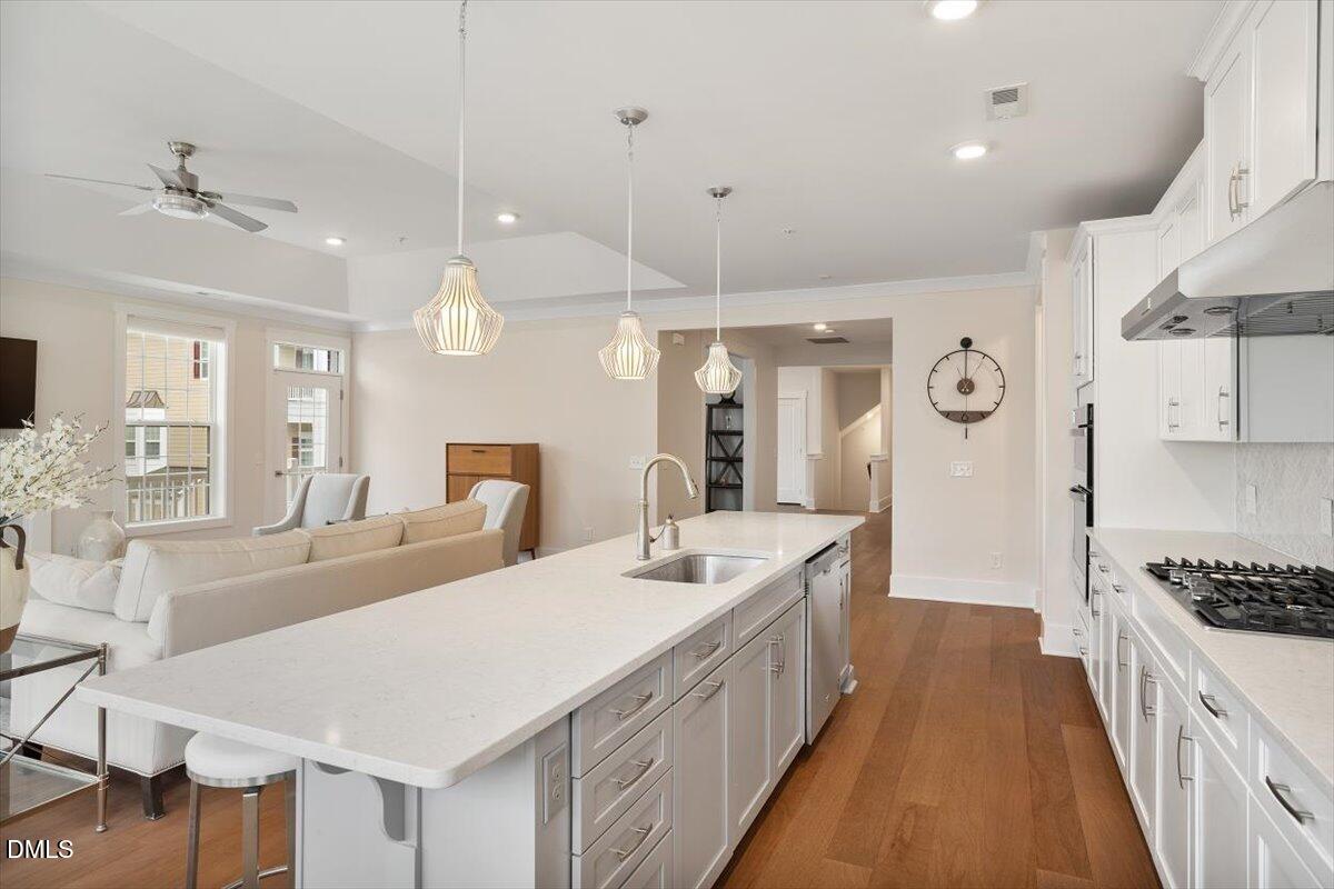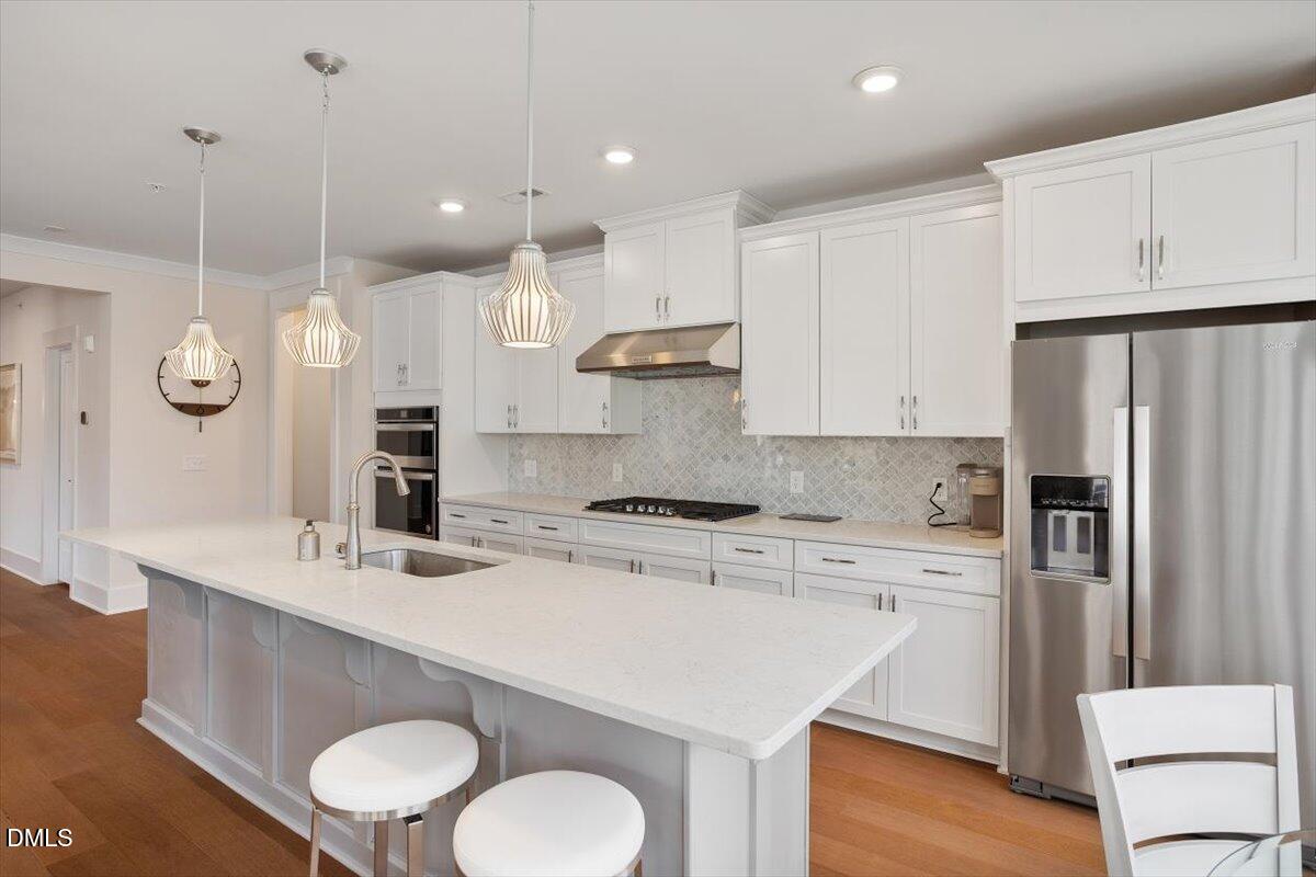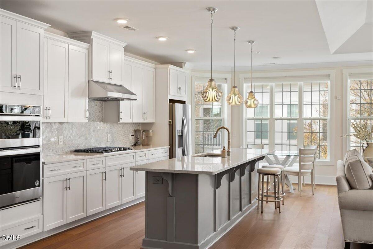 The chef-inspired kitchen is truly the centerpiece of the home, showcasing an impressive 12-foot quartz island ideal for entertaining. Complete with a gas cooktop, designer tile backsplash, premium fixtures, ample cabinetry, and modern finishes, this space is as functional as it is beautiful.