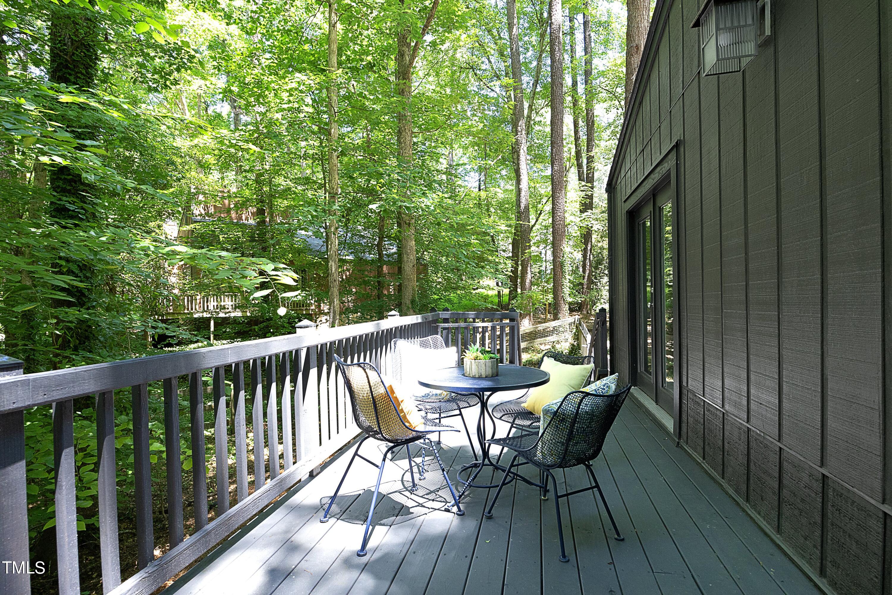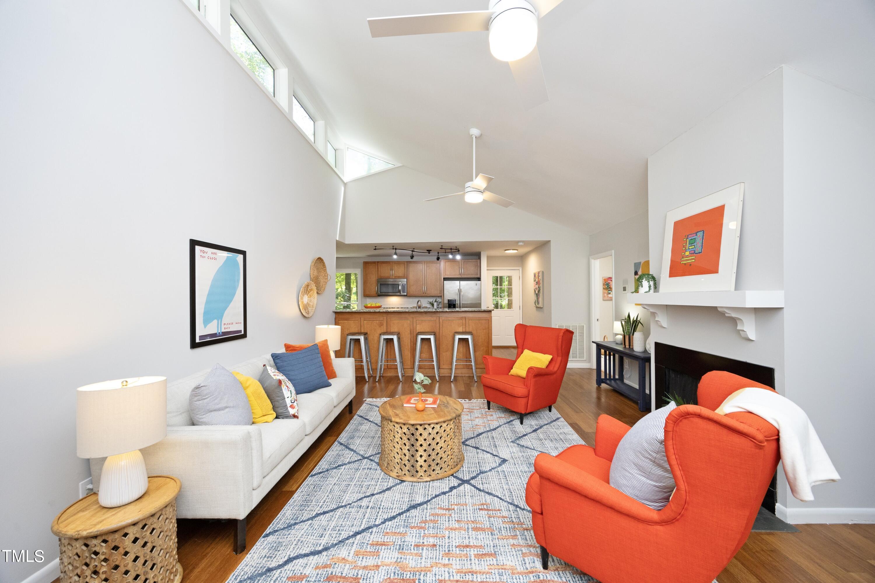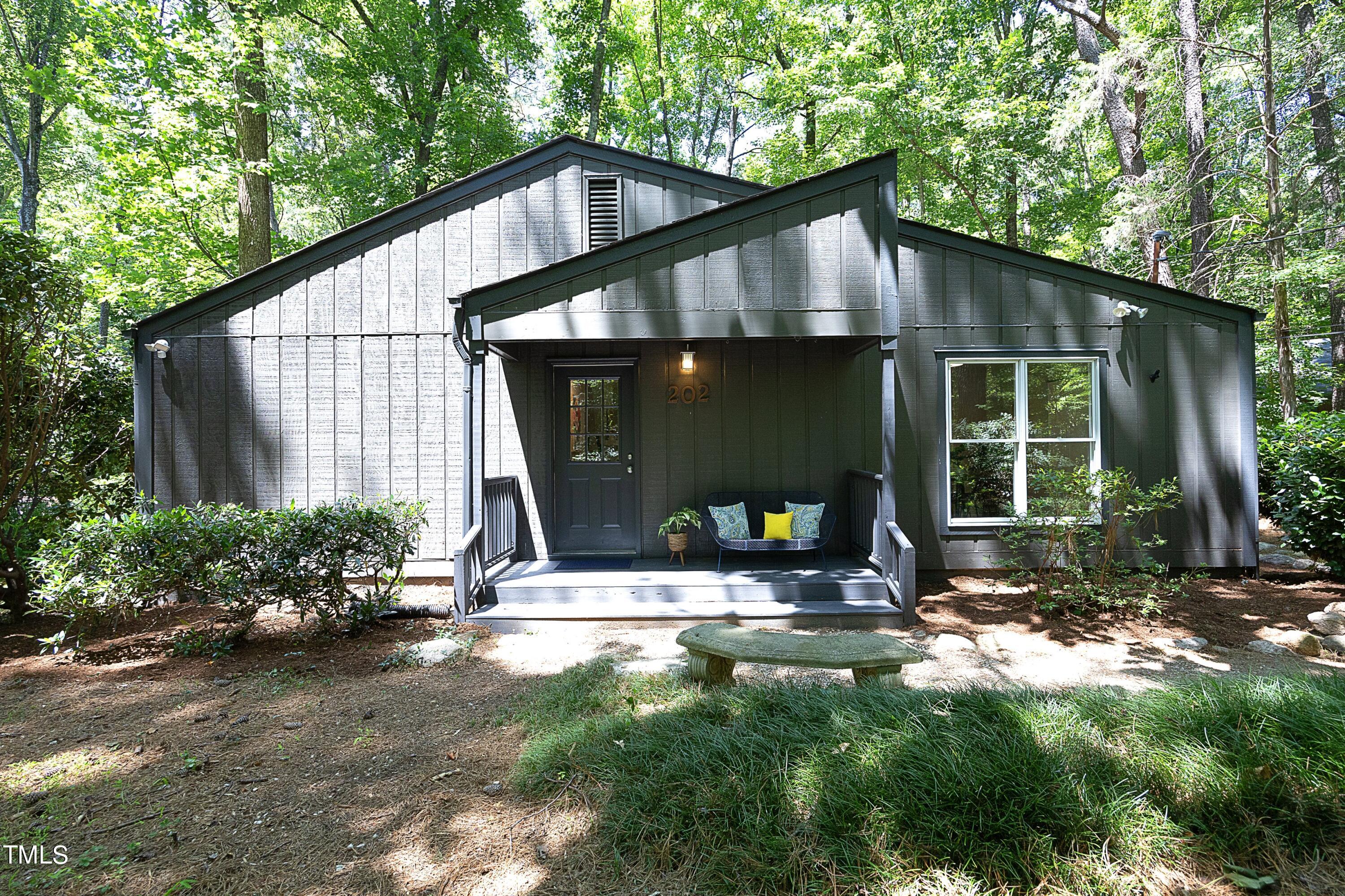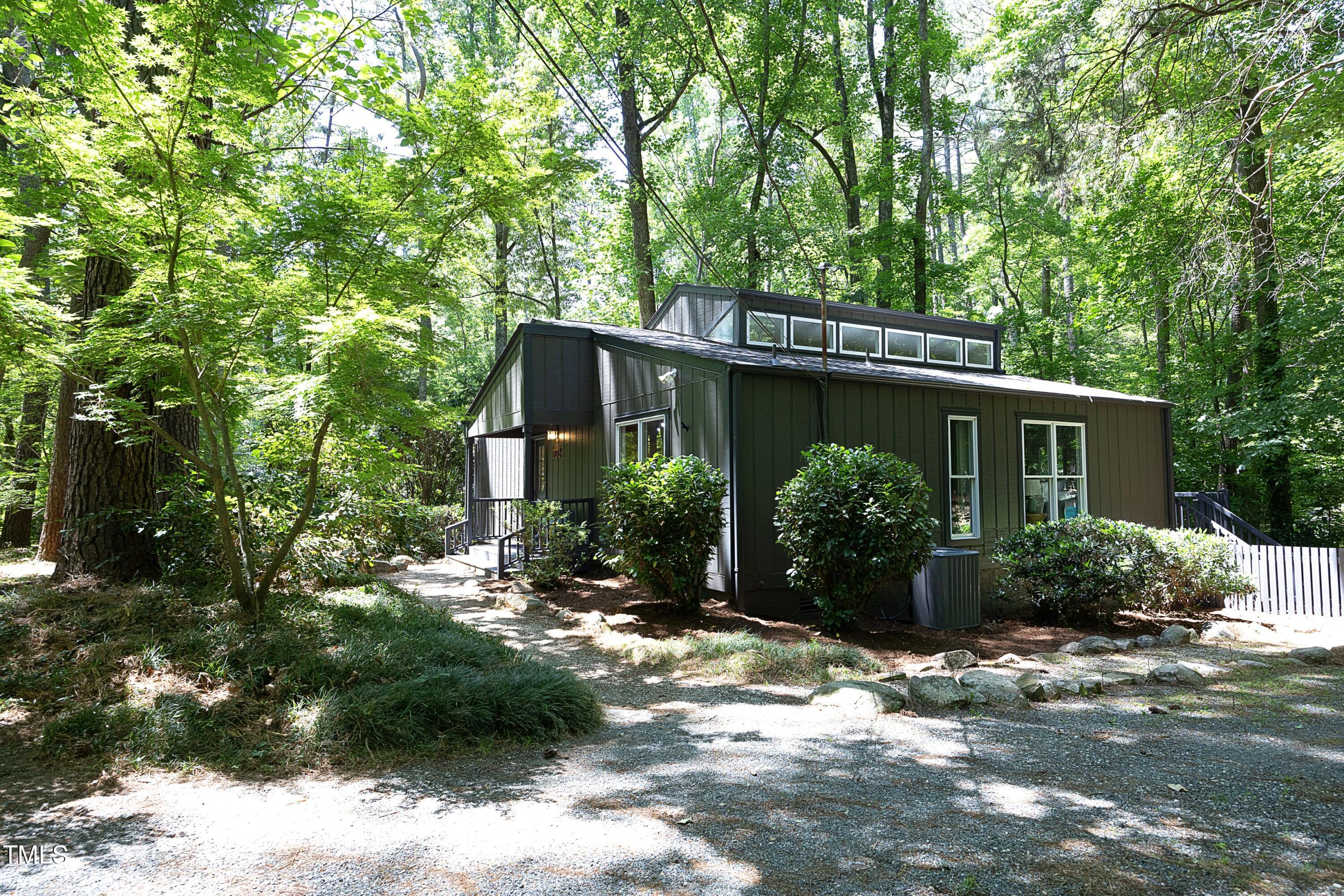 Around the bend in this wooded established and friendly neighborhood sits these lovely single floor open and updated modernist digs. Complete with a covered front porch for sitting and full deck in back overlooking fenced yard and creek. Large great room with double high ceilings, wood floors, wood fireplace, open to an updated and efficient kitchen with granite and stainless. New stove, new dishwasher 2021. Fresh carpet and paint. Updated bathrooms. Roof in 2016. HVAC 2018. Established landscaping. Fire pit. Short distance to Christie Park. Car free dining and services. Convenient to Chapel Hill/Carrboro and all the new great things coming to Chatham. Friendly HOA hosts gatherings and brush pickup.