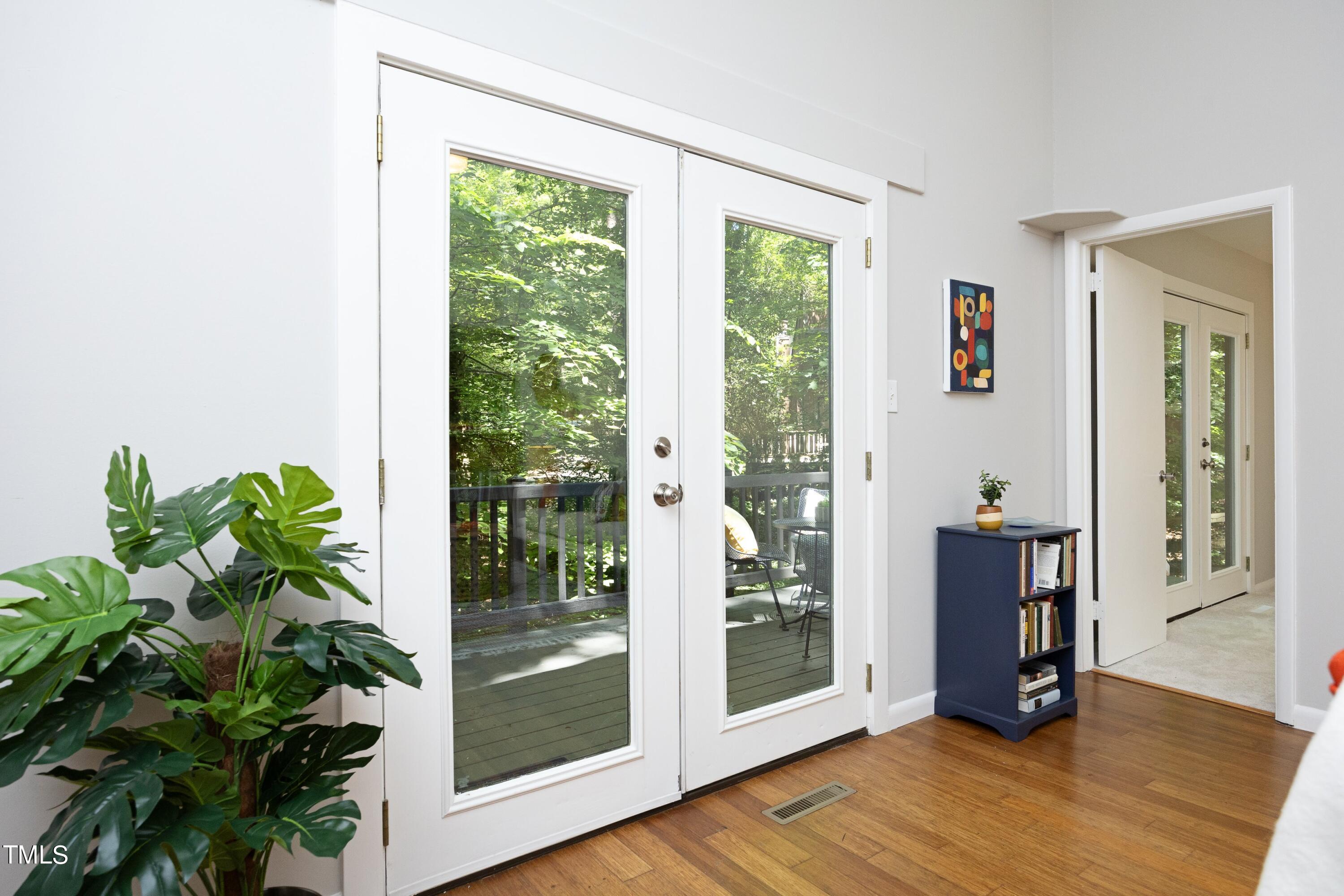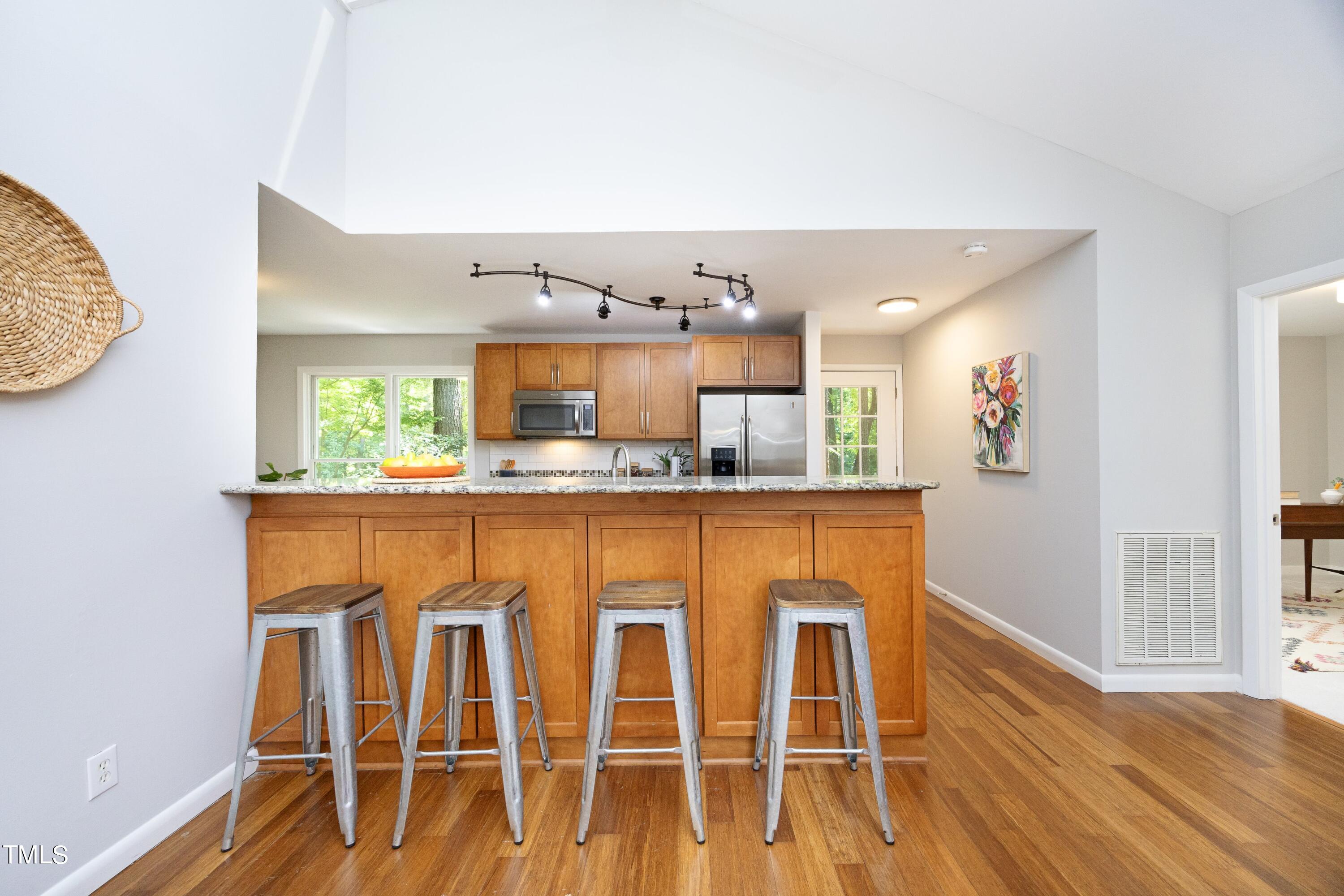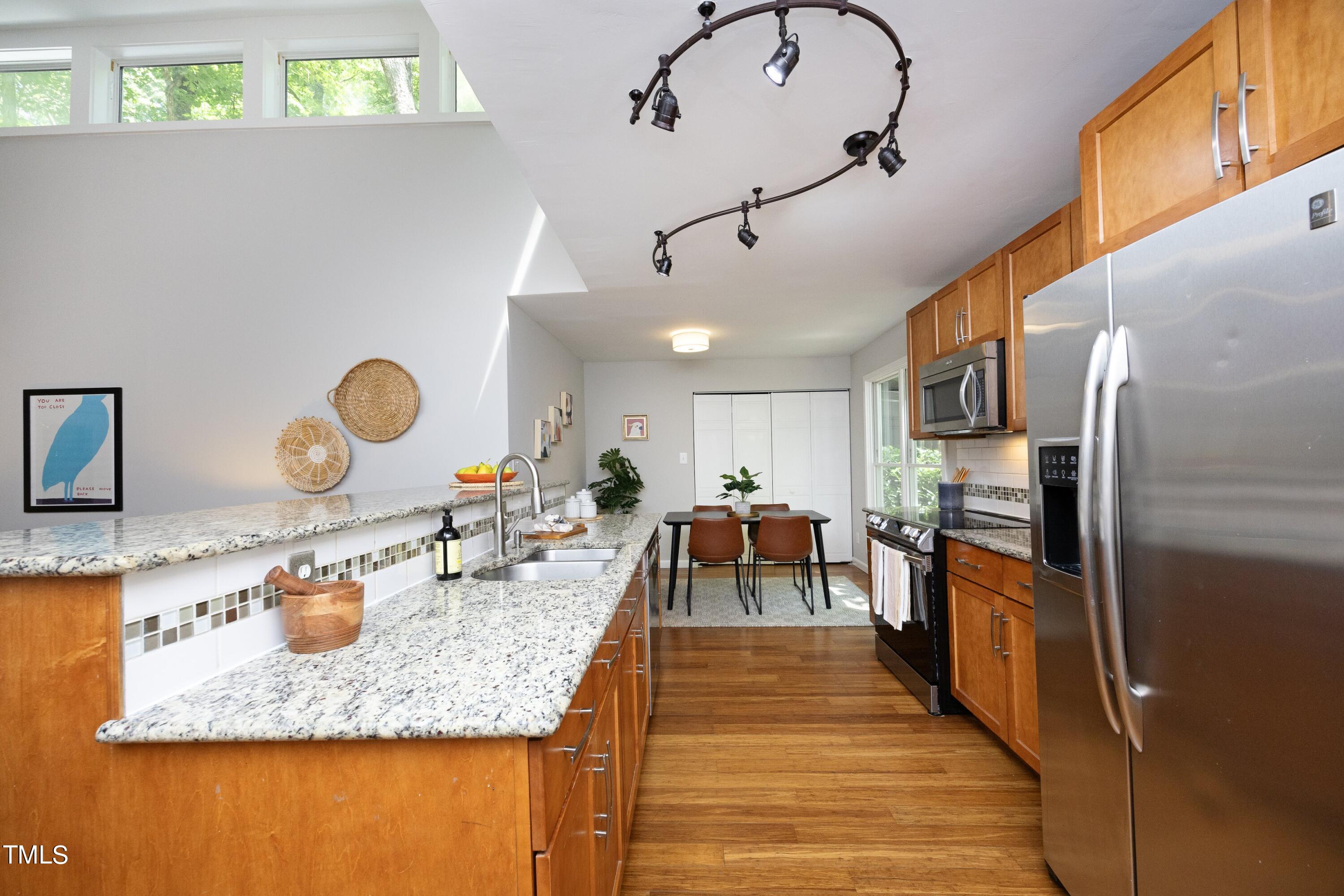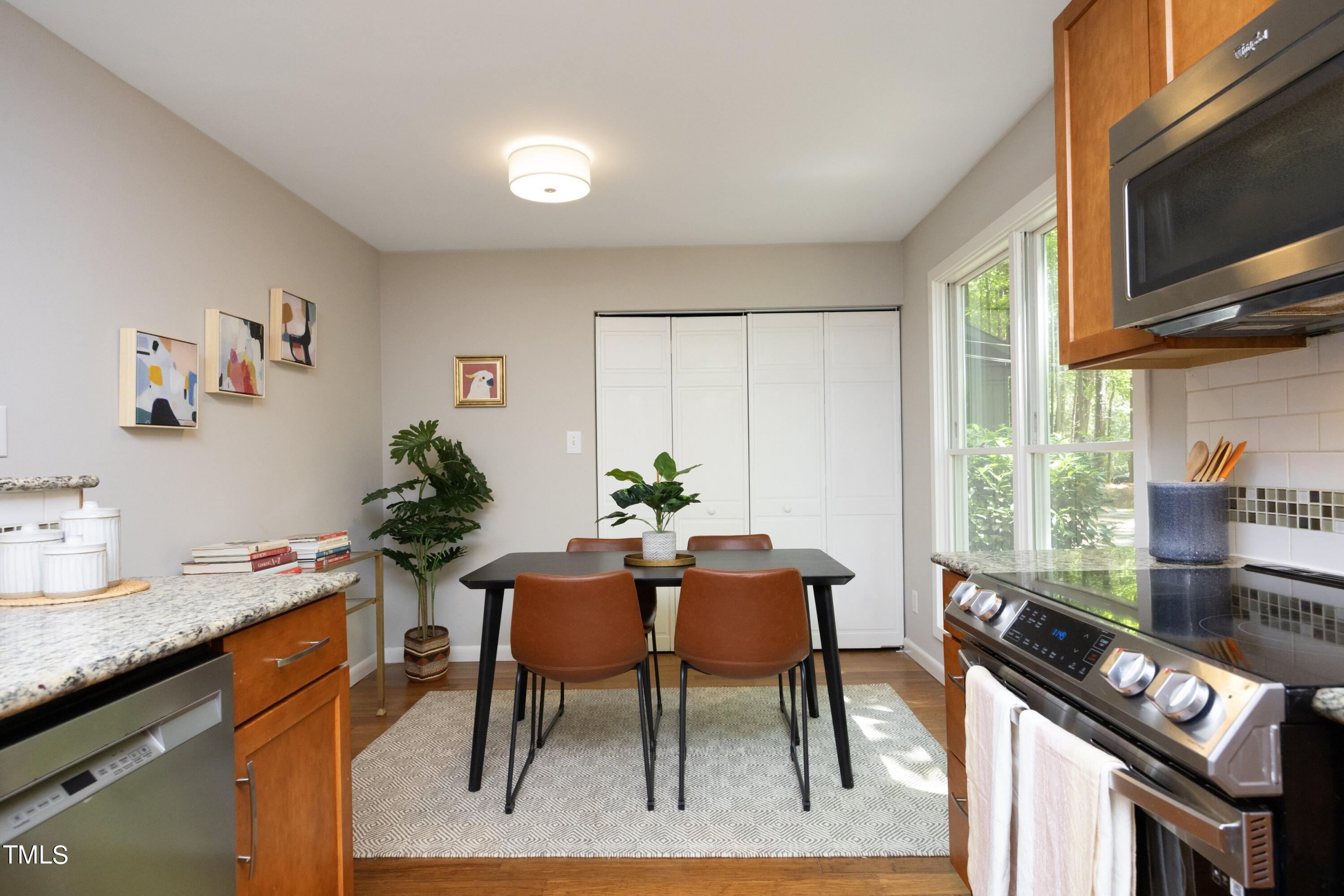Around the bend in this wooded established and friendly neighborhood sits these lovely single floor open and updated modernist digs. Complete with a covered front porch for sitting and full deck in back overlooking fenced yard and creek. Large great room with double high ceilings, wood floors, wood fireplace, open to an updated and efficient kitchen with granite and stainless. New stove, new dishwasher 2021. Fresh carpet and paint. Updated bathrooms. Roof in 2016. HVAC 2018. Established landscaping. Fire pit. Short distance to Christie Park. Car free dining and services. Convenient to Chapel Hill/Carrboro and all the new great things coming to Chatham. Friendly HOA hosts gatherings and brush pickup.