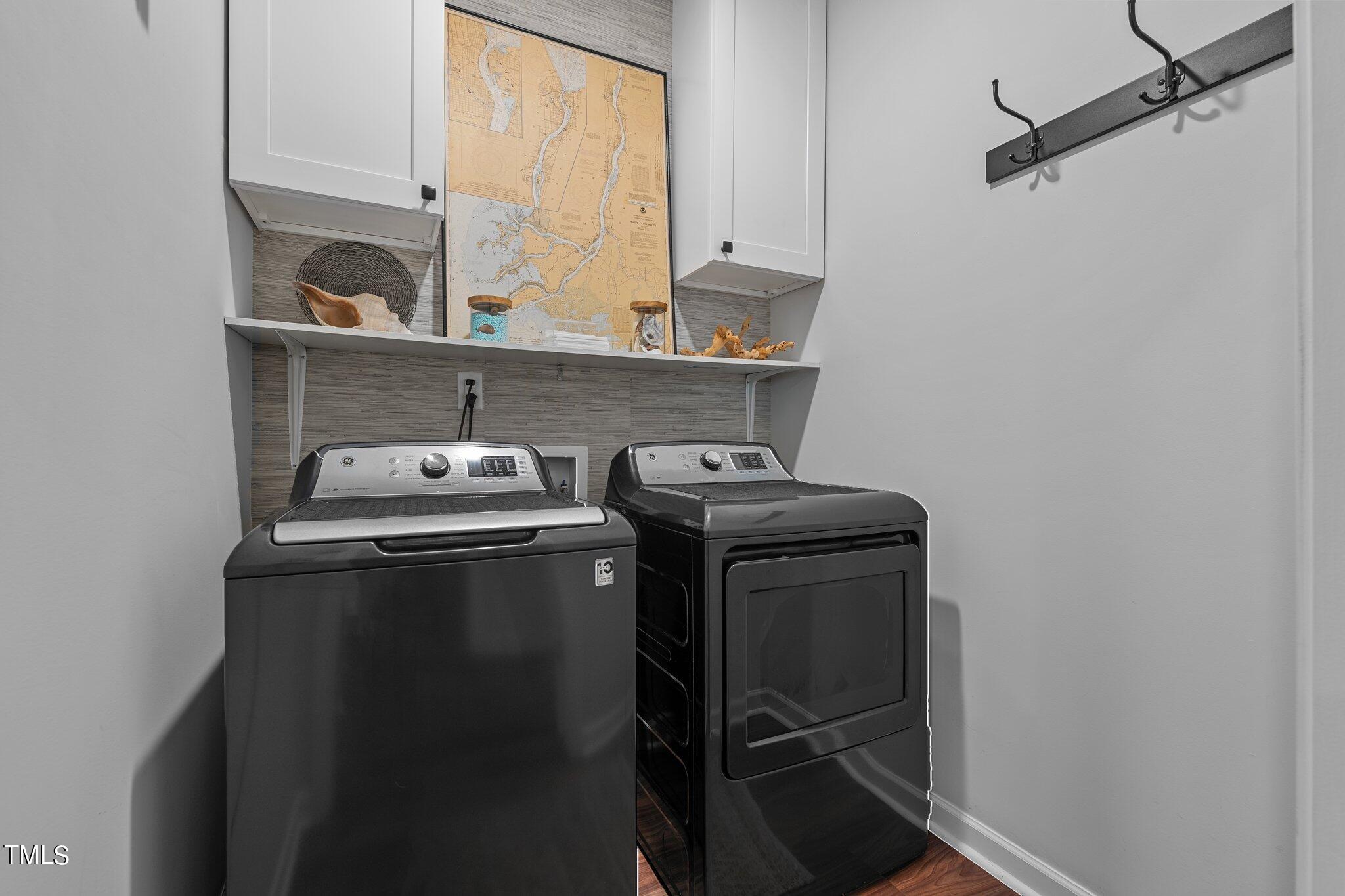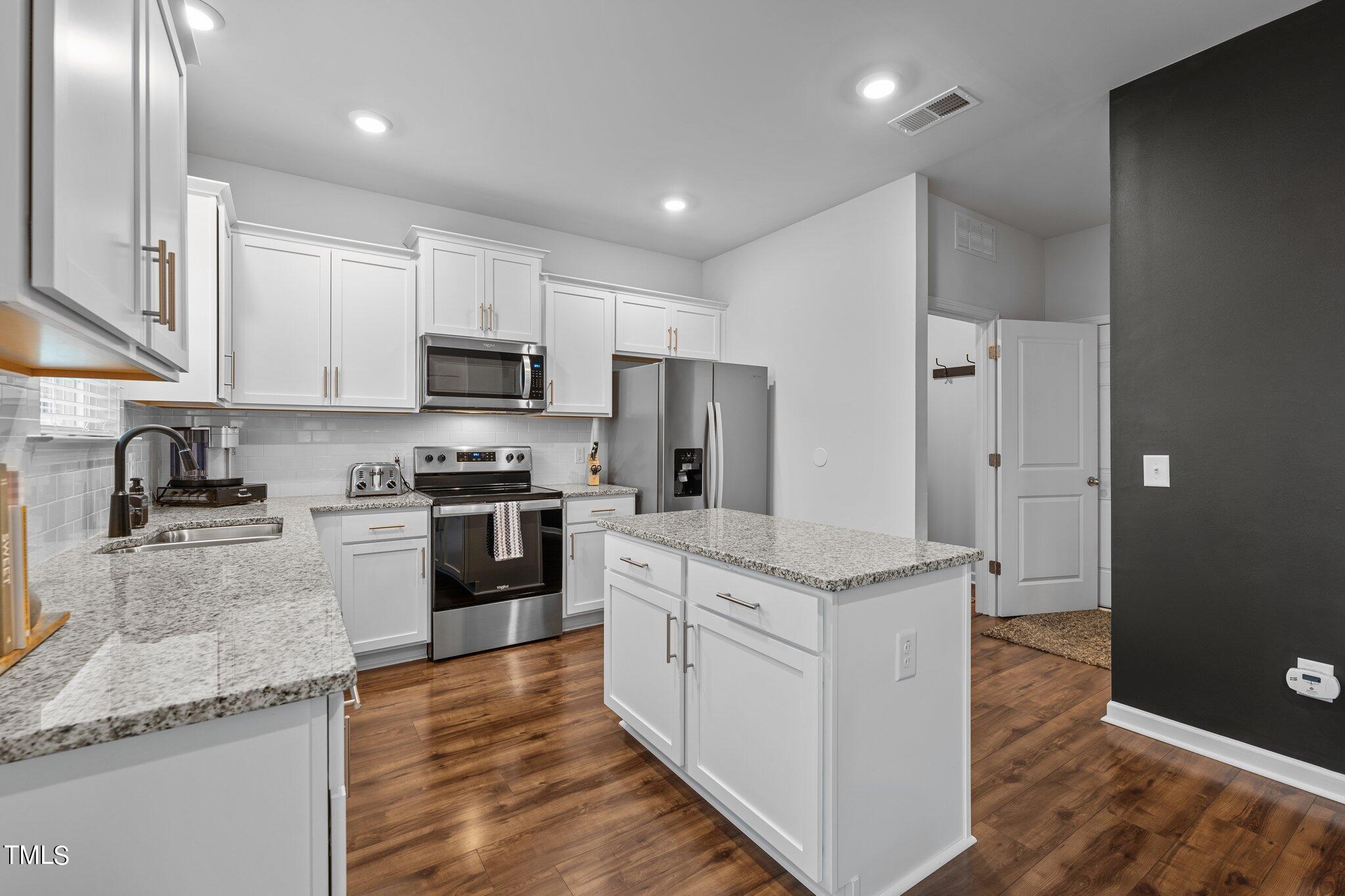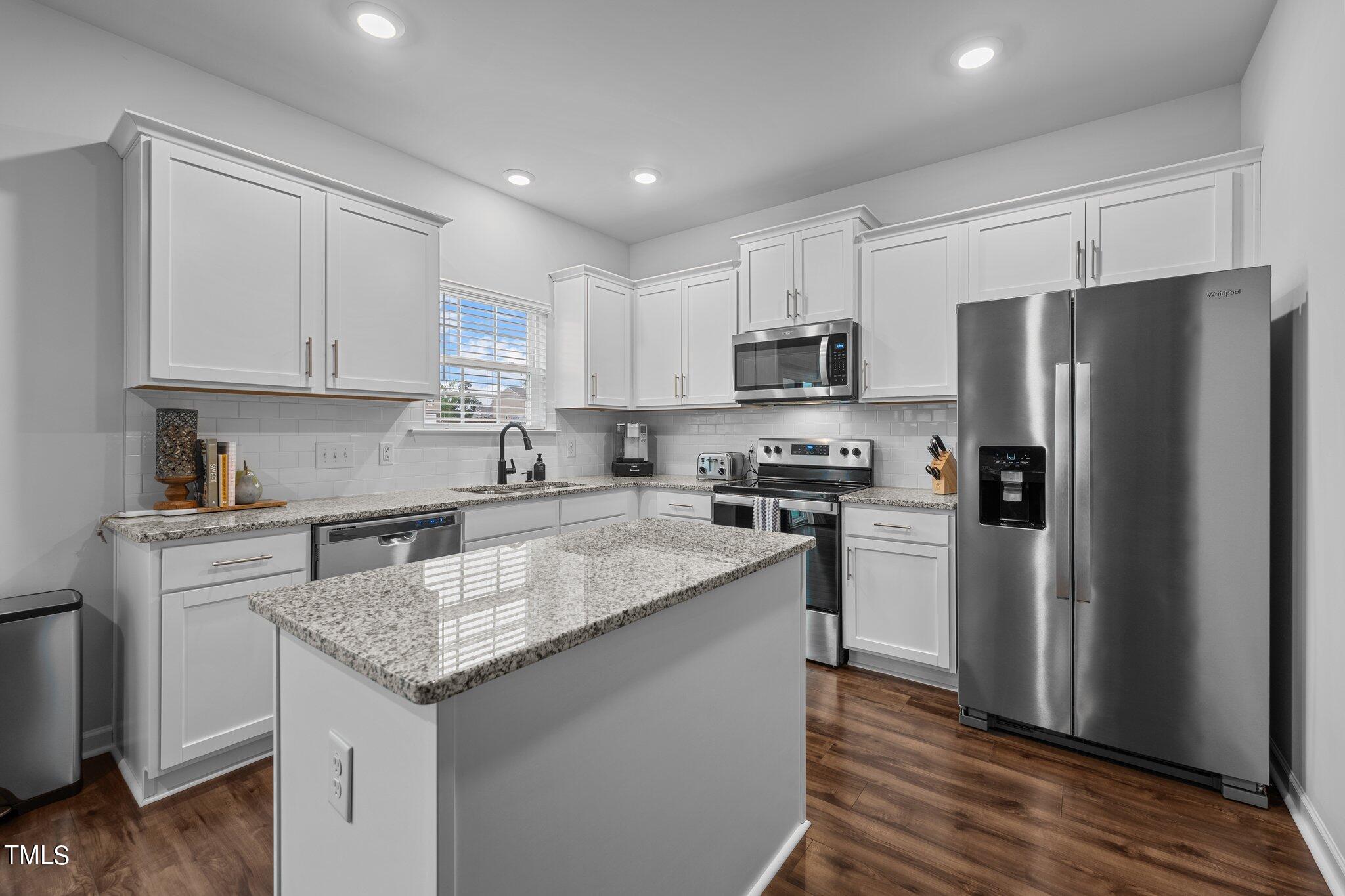 The gourmet kitchen is a chef's delight, featuring a central island, granite countertops, tile backsplash, and stainless steel appliances, making meal prep a breeze. Adjacent is the laundry room, offering convenience and practicality.