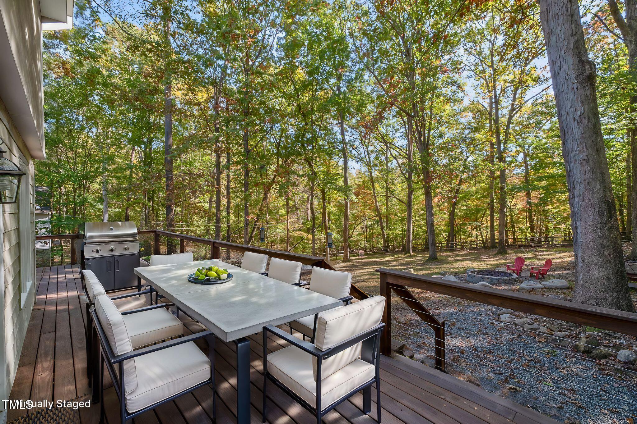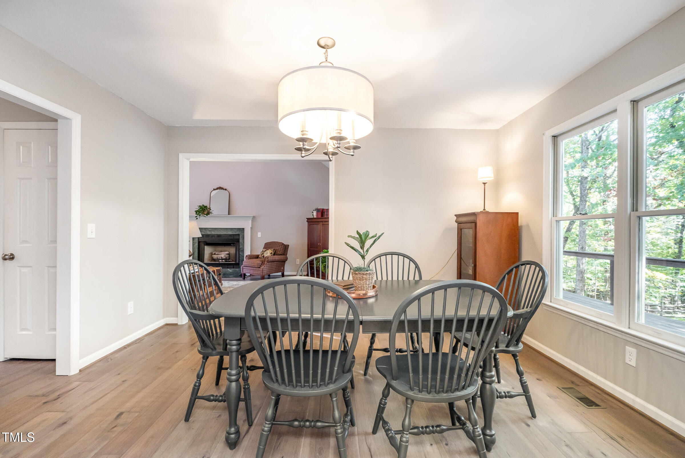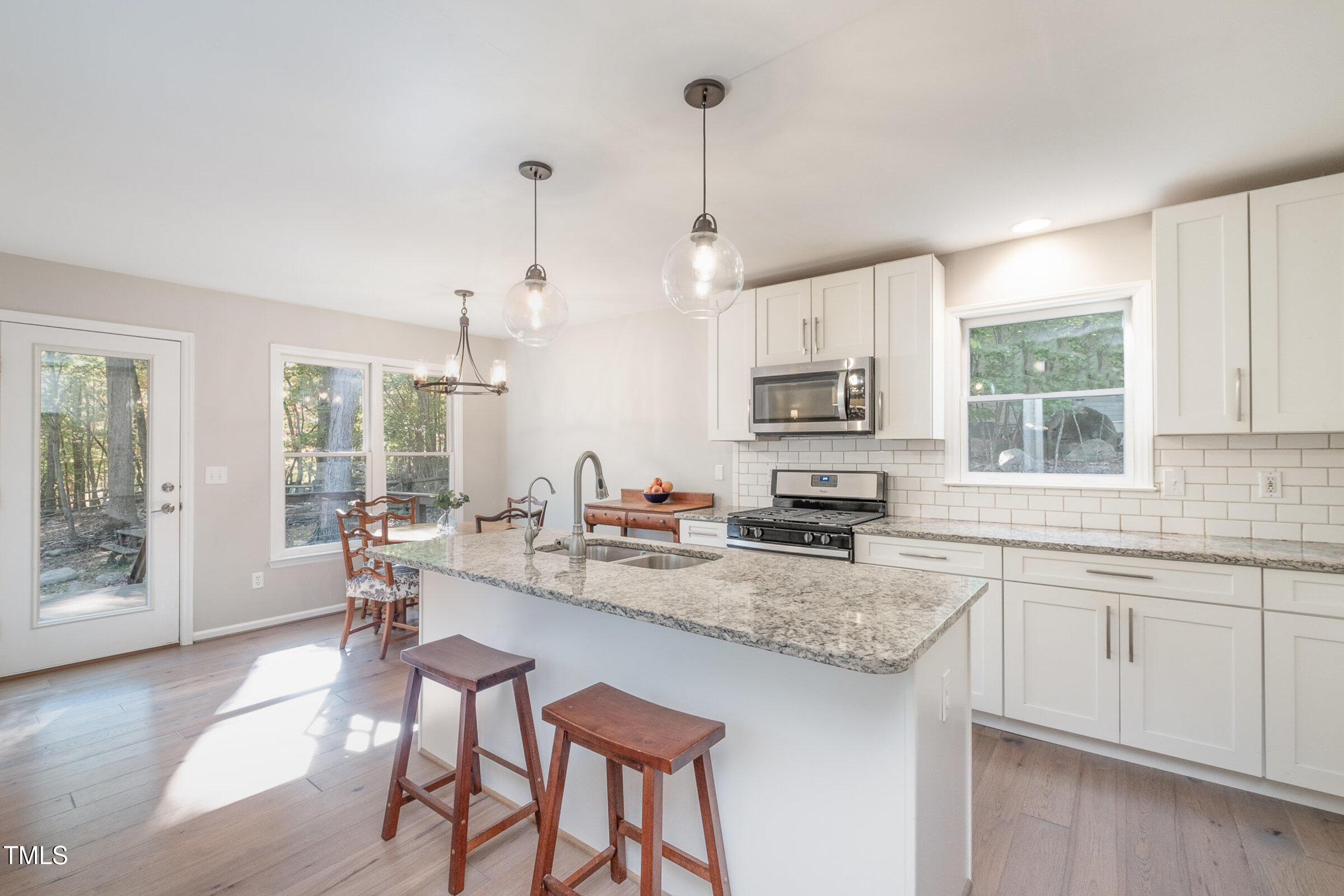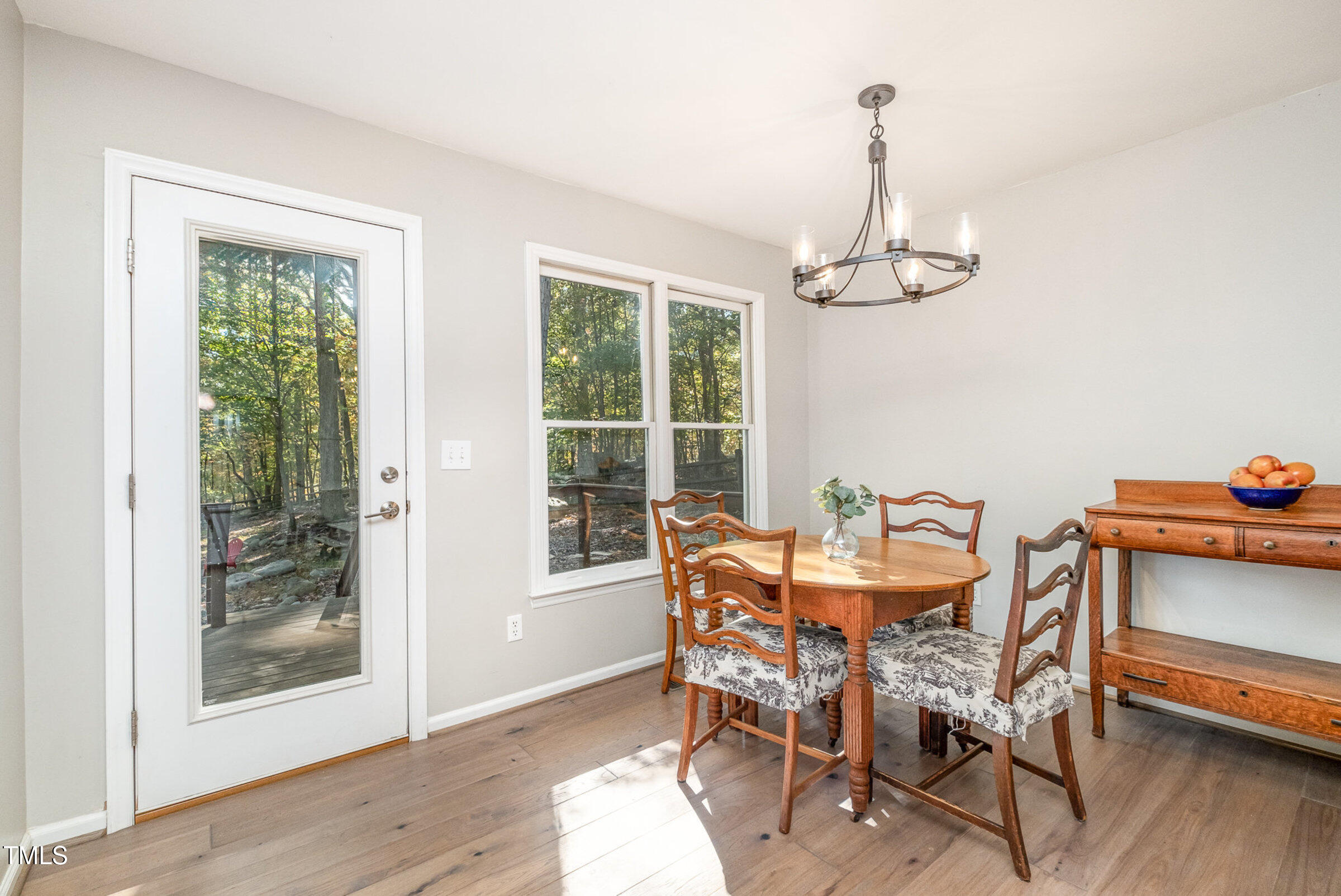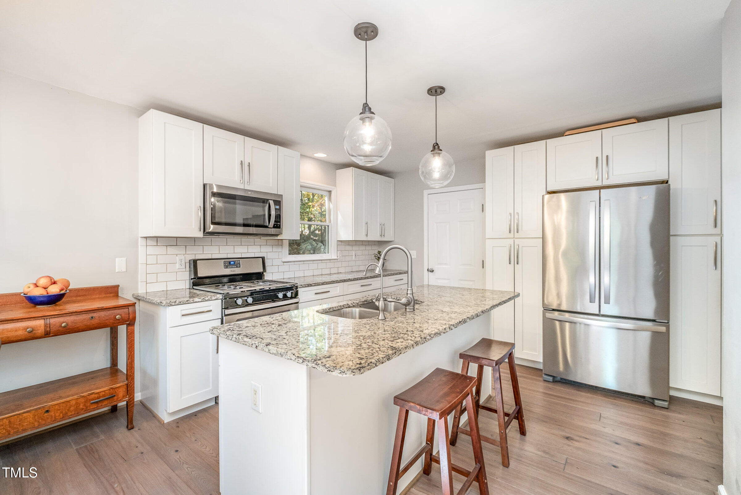 Nestled in the sought-after Highland Forest neighborhood, this updated home offers modern amenities on a spacious .92-acre lot. The open, flowing floor plan is ideal for entertaining or unwinding. The kitchen features newer cabinets, granite countertops, a large center island, updated lighting, flooring, and backsplash--tailored for today's living. Recent upgrades extend to both bathrooms, an HVAC system, and smooth ceilings. Added bonuses include a newer roof and hot water heater creating a home that feels fresh with a contemporary atmosphere while enjoying low maintenance. The outdoors host a large deck with a fire pit invites serene evenings, and landscaping enhancements add to the curb appeal, with an open yard providing excellent privacy, no city taxes, no HOA fees, and a conversion to natural gas for added efficiency. Located in a top-tier school district and near UNC, Falls Lake, and shopping, this property offers the perfect blend of seclusion and convenience.