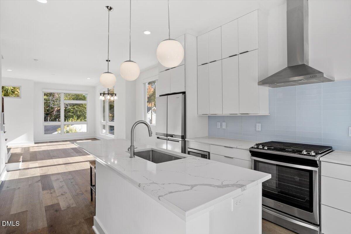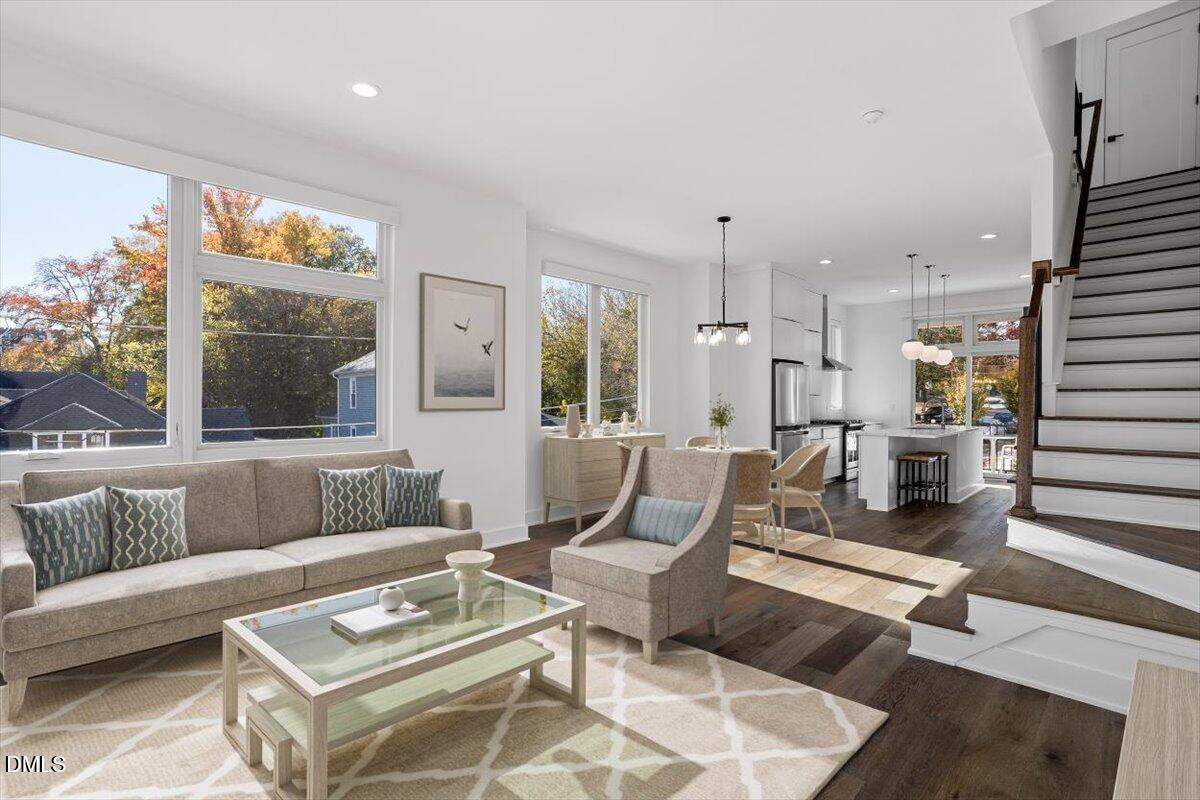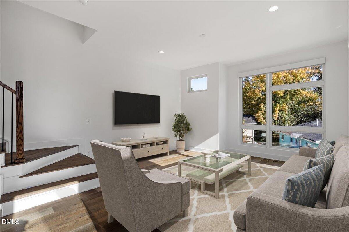 Framed by views of the downtown Durham skyline, this one-of-a-kind, modern and sophisticated end-unit townhome offers an airy open floor plan with soaring ceilings, eastern exposure, and rich hardwoods throughout the main areas.