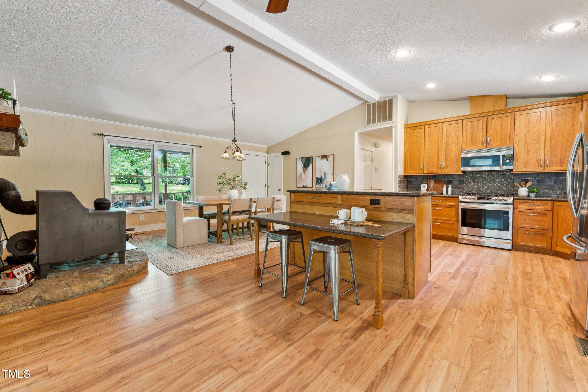 Upon entry, you'll find an open floor plan with vaulted ceilings, recessed lighting, and a cozy wood stove. The kitchen is a cook's dream with Silestone quartz counters, stainless appliances, soft-close oak cabinets, and a large island with bar seating. The primary suite includes a vaulted ceiling, a large walk-in closet, and an ADA-compliant shower with a curb-less stone tile shower entrance. A second bedroom features its own sitting room and ensuite bath, while the third offers clever built-ins and storage.