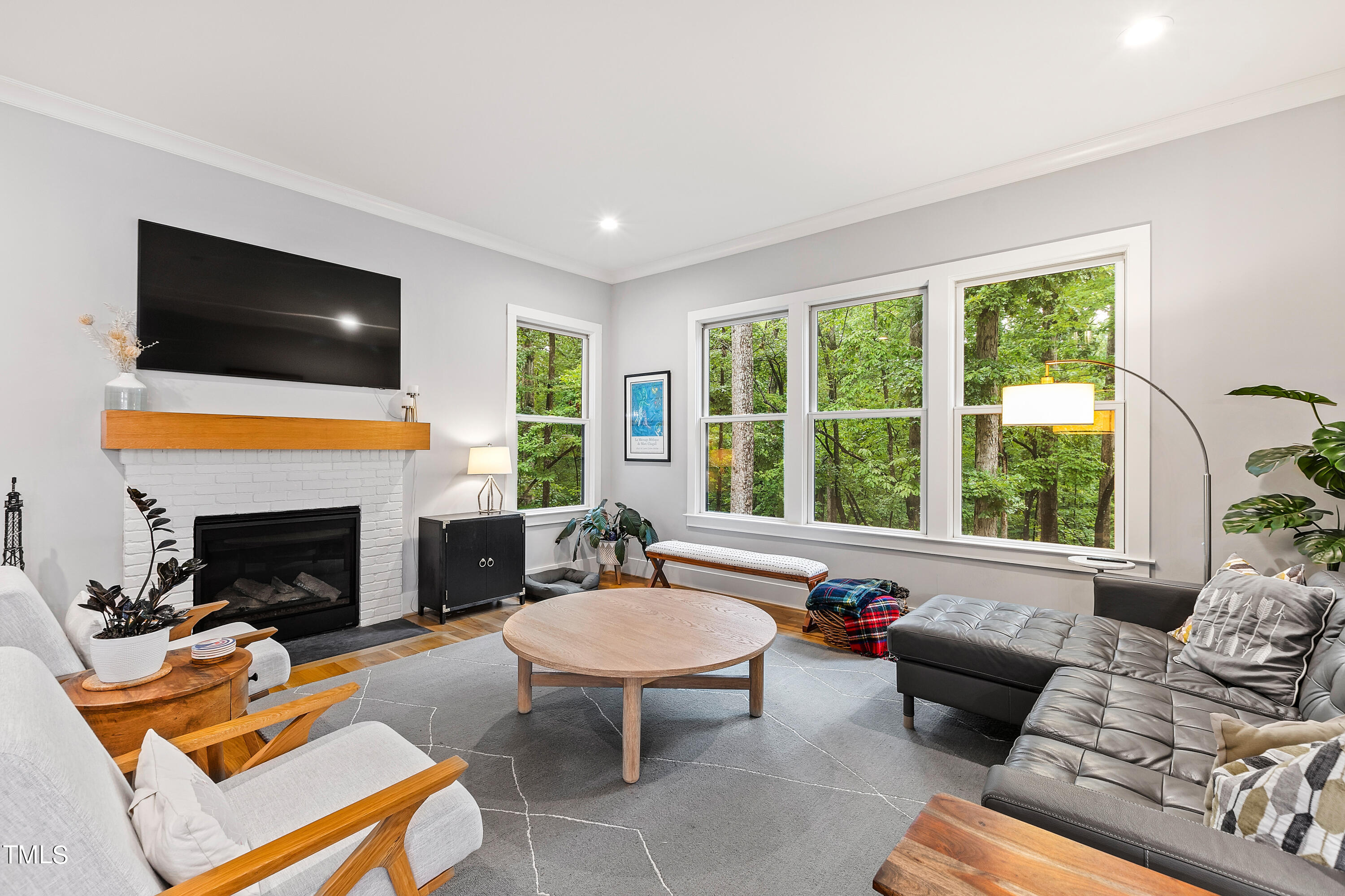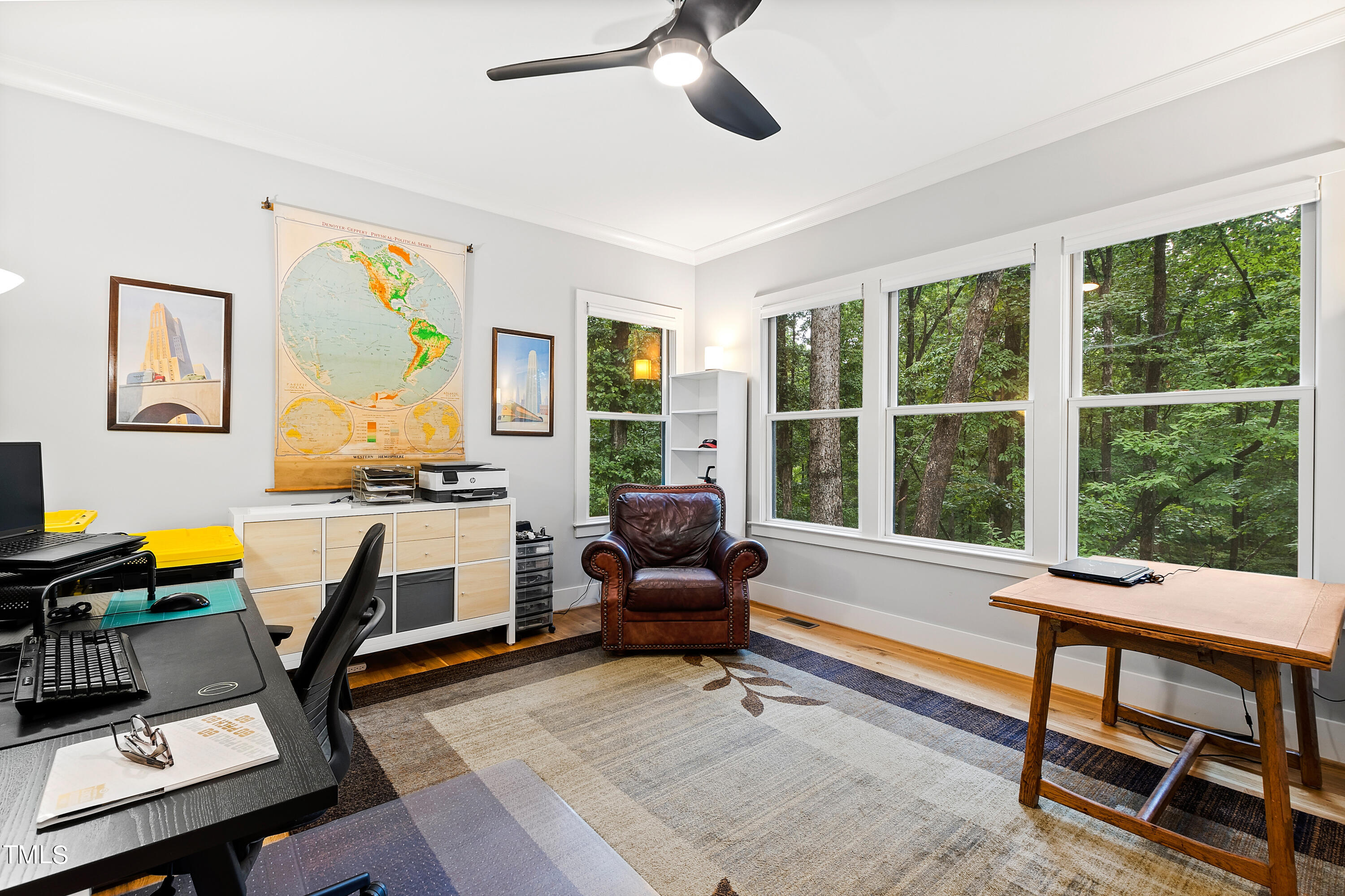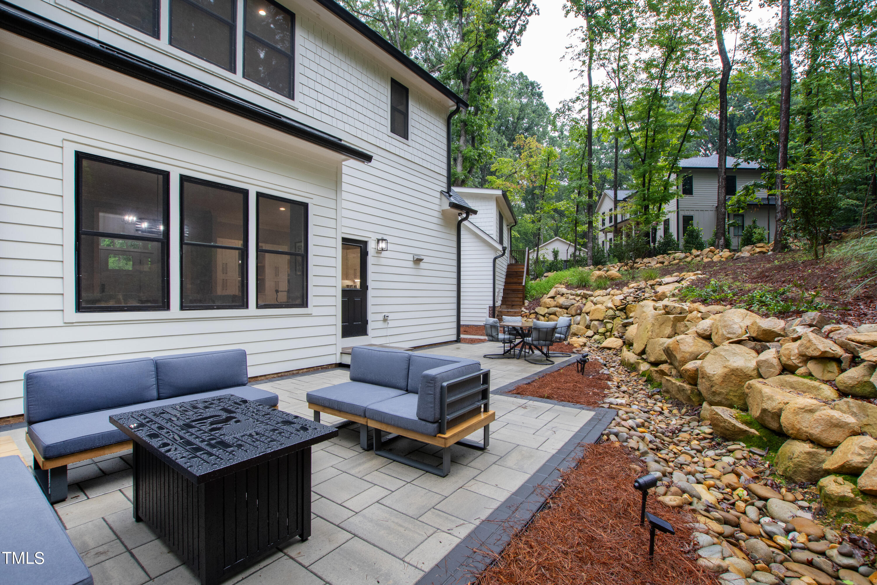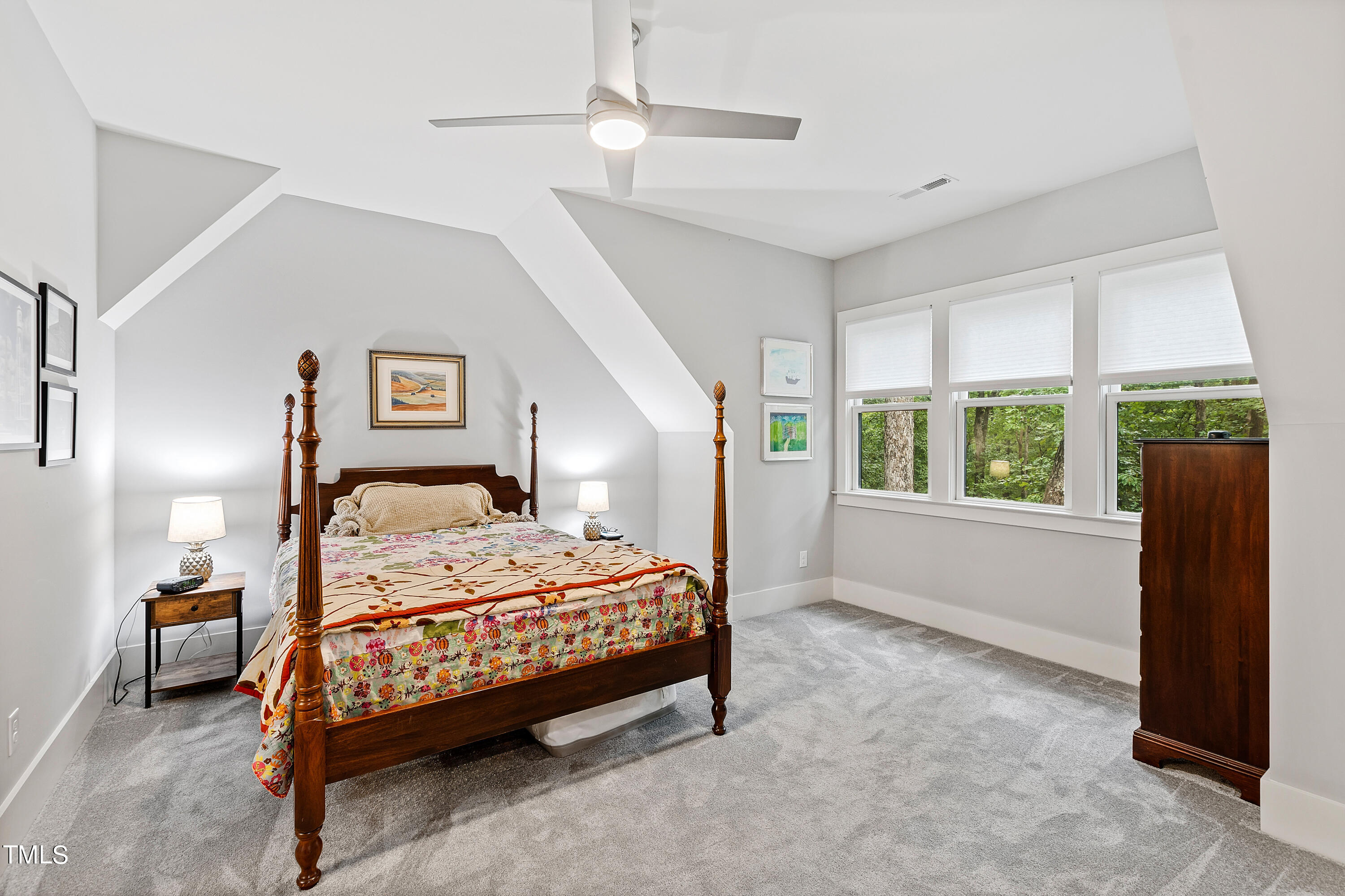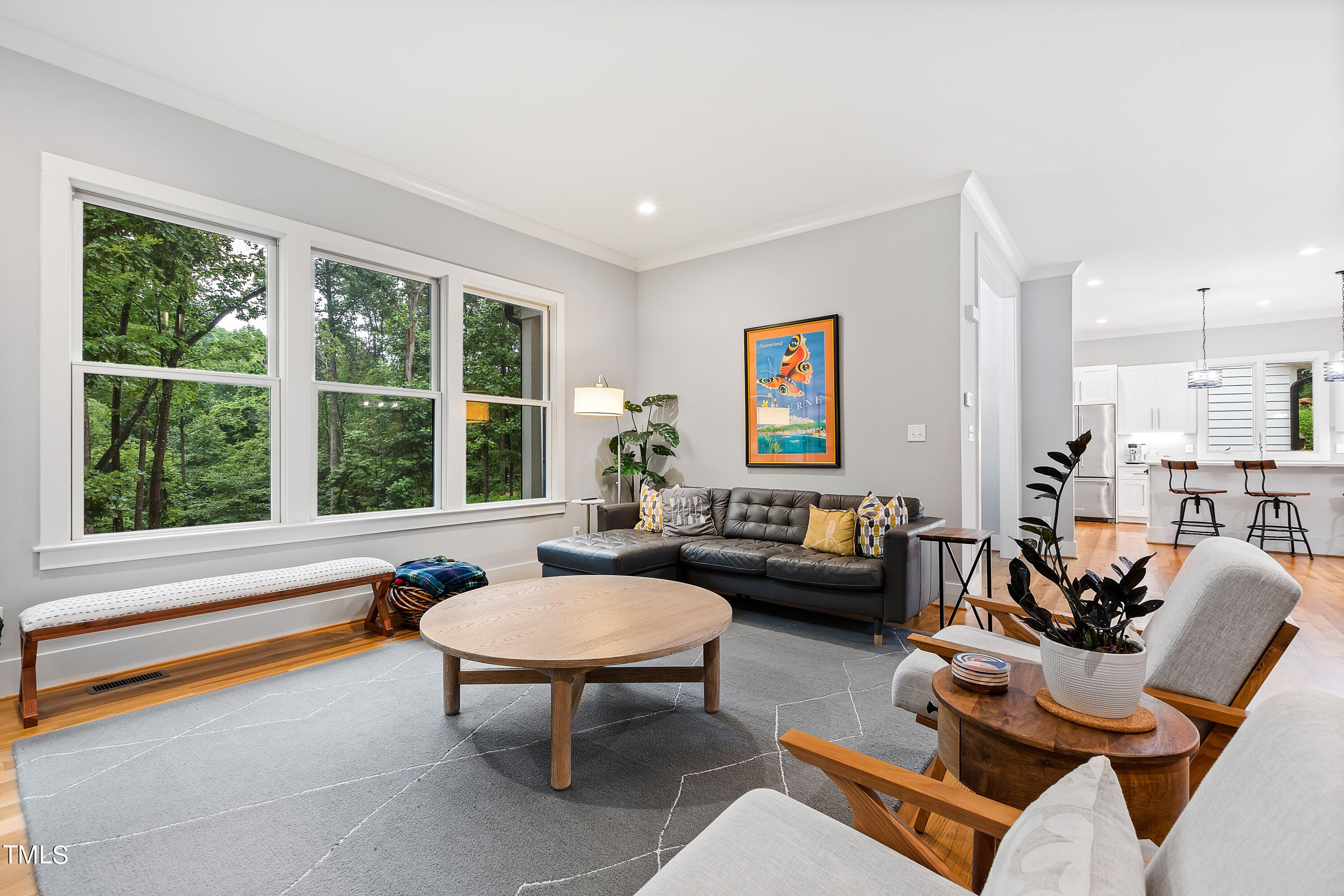 Discover your own secluded retreat in the heart of Chapel Hill. Nestled on a picturesque hillside, this charming home is surrounded by lush, towering trees that offer a serene mountain-like atmosphere right in your backyard. The views from the front porch feel like you're in your own private treehouse, overlooking the breathtaking landscape. This home was carefully constructed to flow effortlessly and ensure you have a view from each angle. The heart of the home is grand and sleek. The first-floor guest suite is ideal for guests or for a home office! Upstairs features a spacious loft, another guest suite, and your primary. The primary is charming as to be expected with views of the lush green backdrop. The primary suite is lovely with tiered countertops, a soaking garden tub, and a walk-in tiled shower. Step out to your stone-back patio and take in the private views while enjoying the sounds of the waterfall. The unfinished storage above the garage is great for storage or easily finished to use as a bonus space! This is the perfect sanctuary for those seeking tranquility and a connection to nature, while still being just minutes away from all the amenities Chapel Hill has to offer. Welcome to your mountain oasis in the heart of Chapel Hill. WHOLE HOME WATER FILTRATION SYSTEM AND WHOLE HOME GENERATOR!